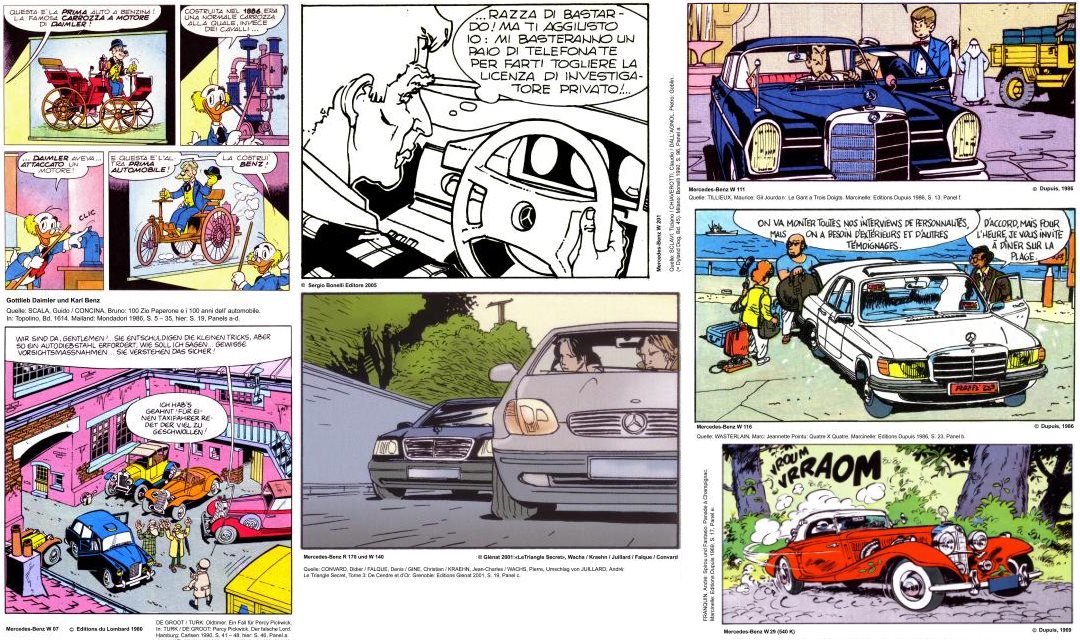 Wer bei der Comic-Lektüre genau hinschaut, der entdeckt vor allem in Serien aus Frankreich und Belgien immer wieder Mercedes-Benz Modelle. Aber auch Comics aus Deutschland, Italien, den Niederlanden, Spanien und den USA tragen zu dieser Bildenzyklopädie der Markengeschichte bei. Manche Zeichner spielen dabei geradezu virtuos mit den Formen der Stuttgarter Fahrzeuge, lassen Lack und Chrom und Kühlerstern im Comic glänzen.