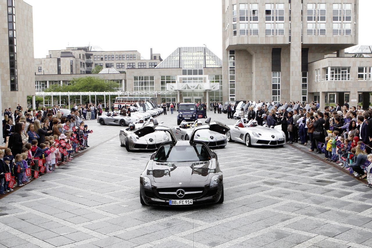 Stuttgart, 11.05.2011 - 25 SLR Kunden und gleichzeitig SLR. CLUB Mitglieder starten am 11. Mai 2011 von Stuttgart-Möhringen zur diesjährigen Mille Miglia. Sie nehmen mit ihren Klassikern der Zukunft als Begleitfahrzeuge im Teilnehmerfeld der Oldtimerrallye teil. Es ist die 7. Teilnahme der SLR. CLUB Mitglieder am italienischen Traditionsrennen. Im exklusiven Feld sind 16 SLR Coupés, SLR Roadster und SLR 722 S sowie 9 SLR Stirling Moss Fahrzeuge vertreten.